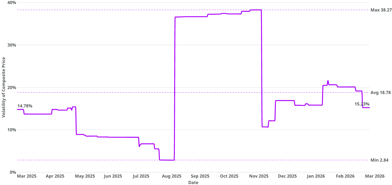 The volatility of the composite price is calculated based on price movements within a 90-day rolling window ending on that date. The bar chart below displays the mean volatility from January 1, 2026 until March 30, 2026.