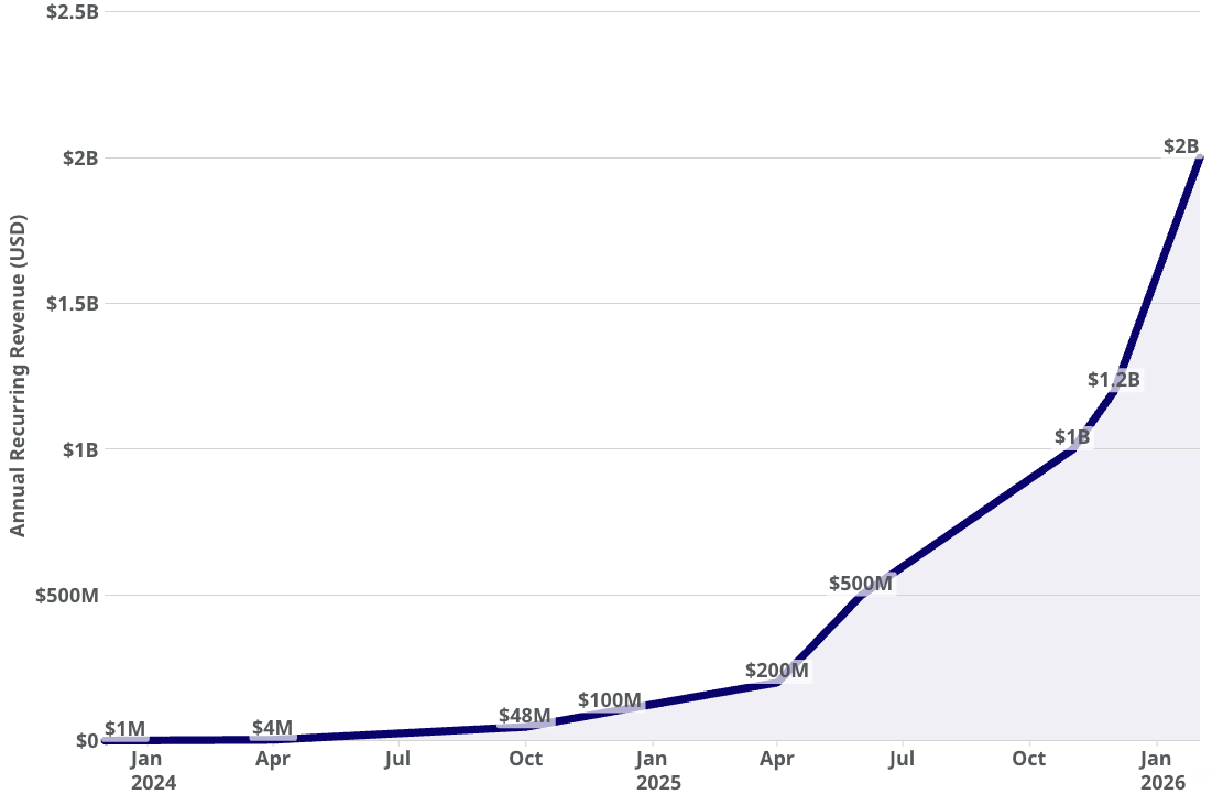 - Scale & Volume: ARR reached $2B by February 2026, up from $1B in late 2025