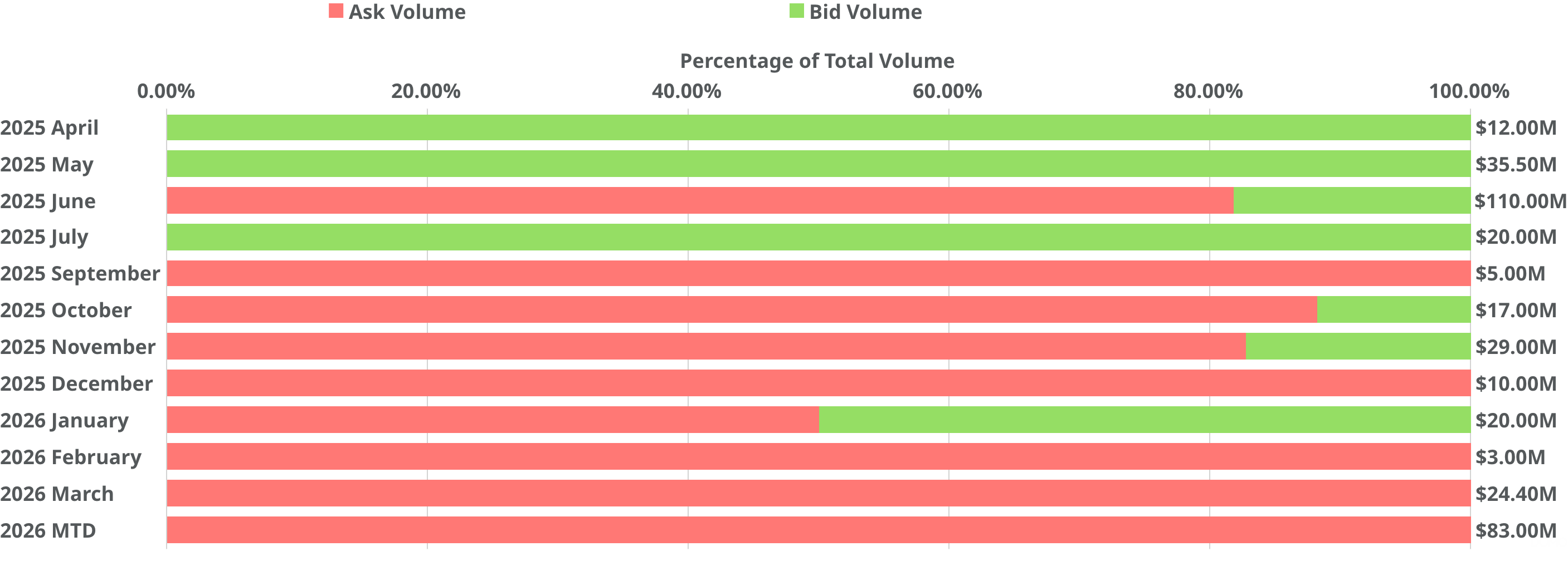 - Monthly Bid-Ask Volume: Bid and ask volume peaked at $110 million in June 2025, the highest level observed during the period