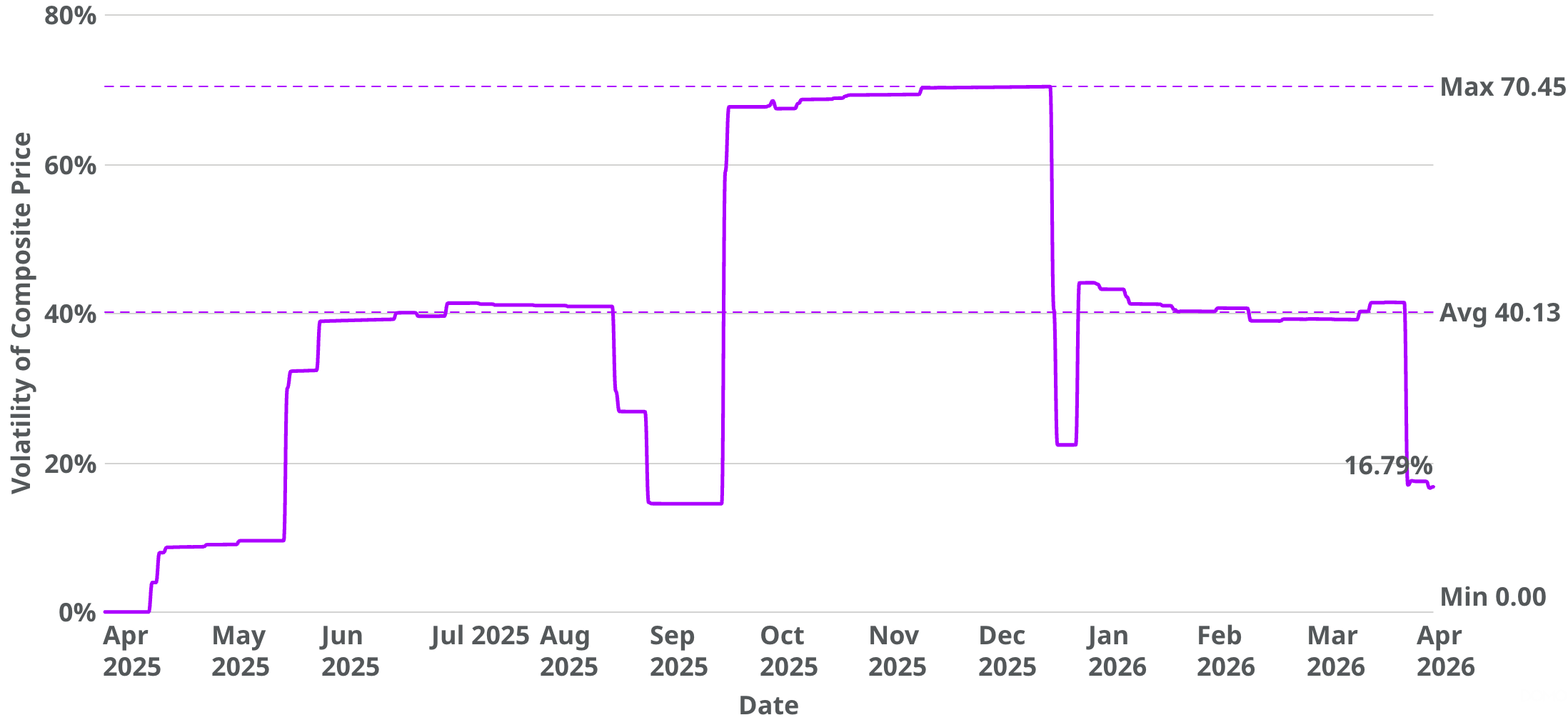 The volatility of the composite price is calculated based on price movements within a 90-day rolling window ending on that date. The bar chart below displays the mean volatility from January 1, 2026 until April 27, 2026.