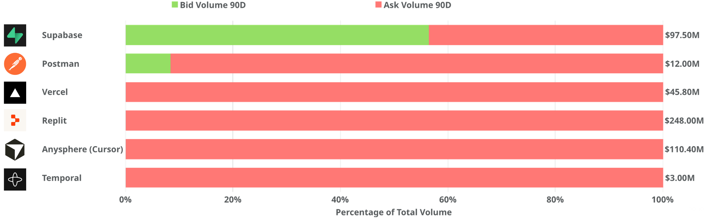 - Highest volume: Replit, $248 million