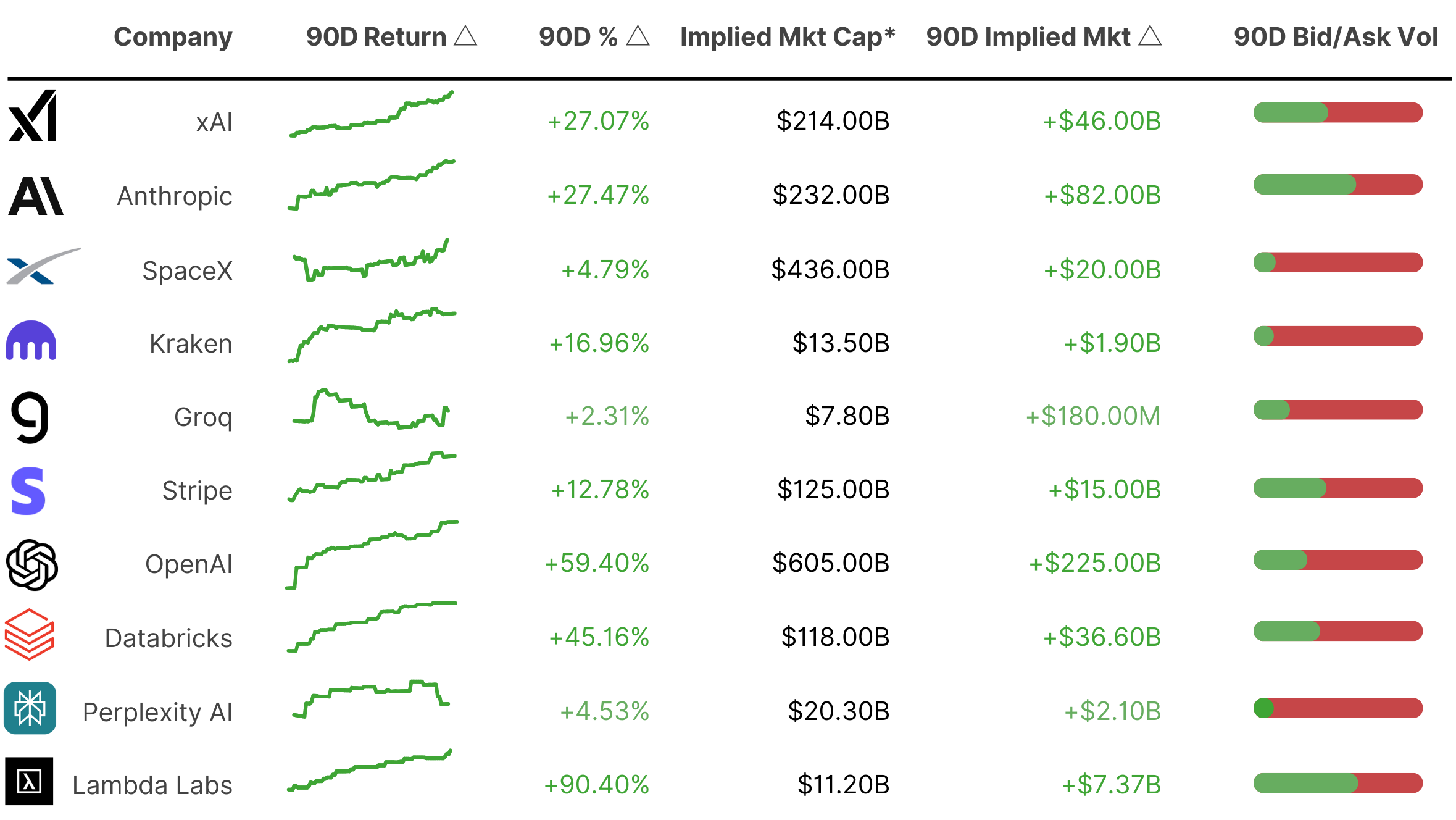 PM Insights uses composite prices based on institutional-sized broker contributions within the last 90 days to compute implied valuations. The current implied valuations reported below were computed as of November 17, 2025, and are compared to each company's latest funding round valuation and valuation on December 31, 2024: