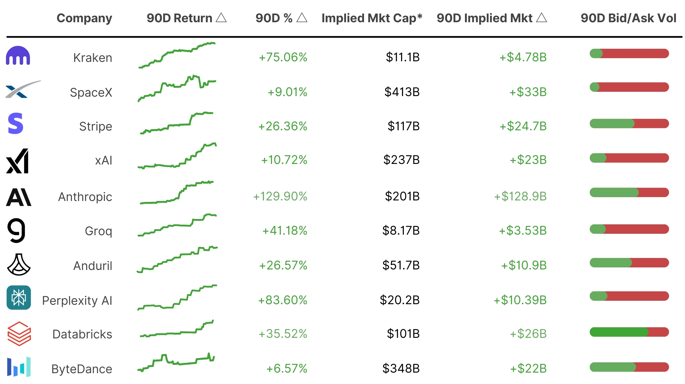 - 90-Day Stock Performance: The ten most active private market companies recorded positive returns over the past 90 days.